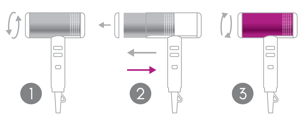Draai het filter aan de voorkant van de Diva Pro Atmos Dryer los van de föhn. Schuif de huidige Sleeve van de haardroger en vervang deze door een Sleeve in de kleur van jouw keuze. Draai het filter weer op de voorkant van de föhn.