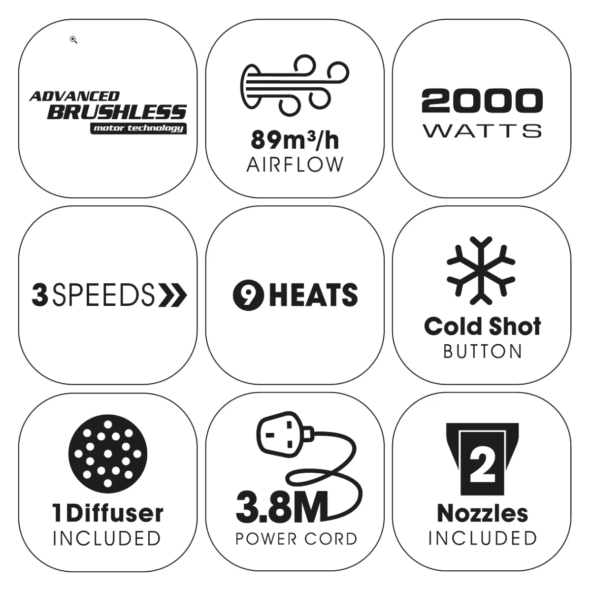 Met zijn digitale brushless motor, met een levensduur van maar liefst 10.000 uur, levert deze haardroger een indrukwekkend vermogen van 1650 tot 2000 Watt. Dit betekent dat het haar in een mum van tijd droog is en gestyled kan worden.