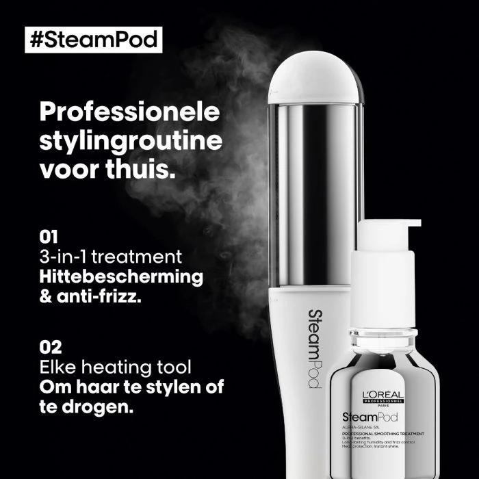 Of je nu een SteamPod of een andere stijltang gebruikt, de Smoothing Treatment is compatibel met alle stylingtools. Voor de beste resultaten raden we aan om de SteamPod te gebruiken. Hiermee krijg je niet alleen de beste styling, maar ook de ultieme bescherming.