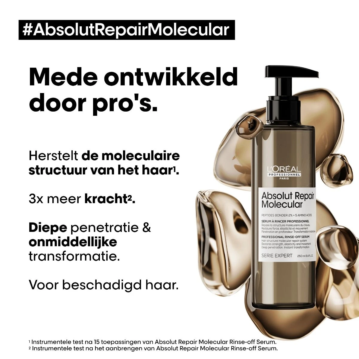 Laat het haar transformeren en herstel de moleculaire structuur ervan met L’Oréal Professionnel Absolut Repair Molecular Liquid Treat Serum. Verwen het haar met de kracht van moleculaire reparatie en geniet van +67% meer kracht, wat neerkomt op 3 keer de kracht die het haar verdient.