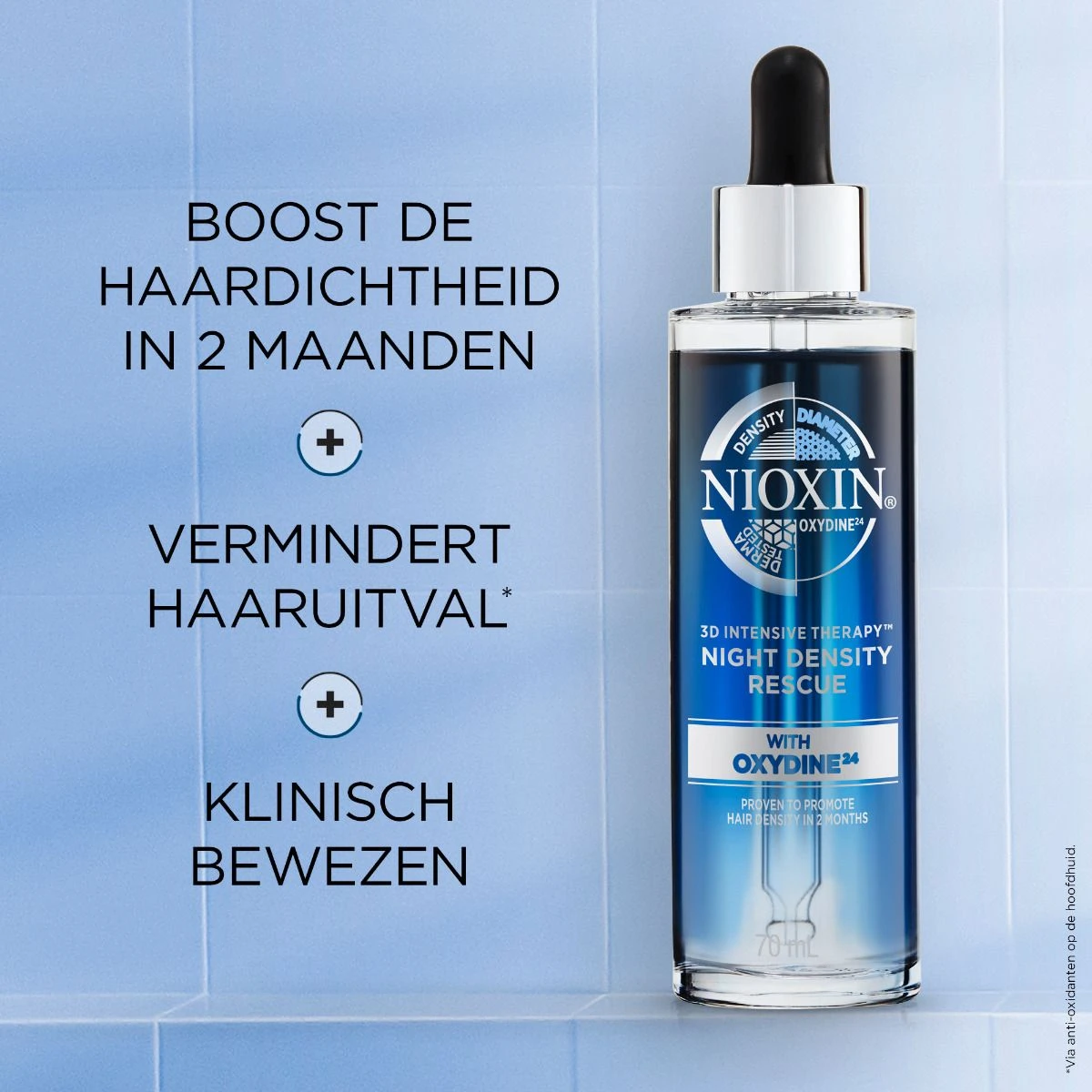 Haar wordt vaak gezien als een van de belangrijkste kenmerken van schoonheid en identiteit. Dunner wordend haar en haarverlies zijn dan ook een groot probleem voor veel mensen. Met NIOXIN Night Density Rescue is dit verleden tijd en kun je nu ook ’s nachts de strijd aan gaan met dunner wordend haar! NIOXIN Night Density Rescue bevat de baanbrekende NIOXYDINE24 technologie die klinisch bewezen de dichtheid van het haar bevordert door haarverlies te verminderen. De leave-in treatment bevat onder andere krachtige antioxidanten, waaronder Vitamine E Acetate, gemberwortelextract, cafeïne en biotine. Van deze antioxidanten is bekend dat ze beschadiging op de hoofdhuid aanpakken en neutraliseren!