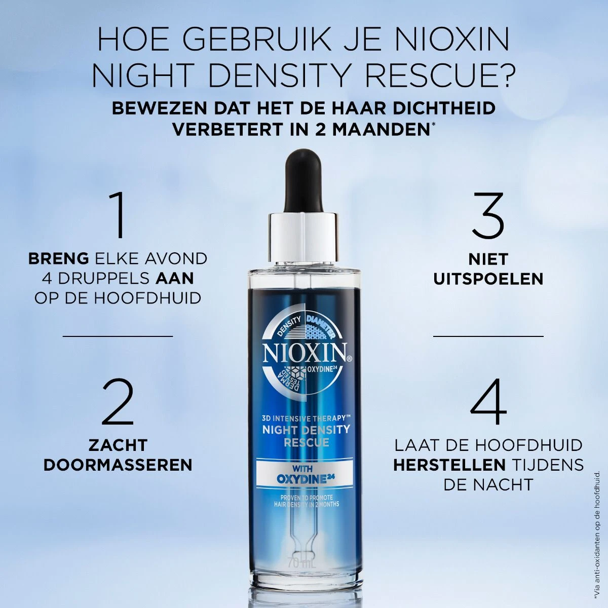De nacht is het beste moment voor het lichaam om te rusten en schade te herstellen. Dit is een geweldige kans om daarvan gebruik te maken voor de verzorging van het haar en de hoofdhuid. Night Density Rescue wordt direct op de hoofdhuid aangebracht met de bijgeleverde pipet. Het heeft een kalmerende geur die zeer geschikt is voor gebruik in de nacht. Ook geeft het geen productresten af op het hoofdkussen. Deze leave-in kan worden gebruikt als aanvulling op alle bestaande NIOXINproducten.