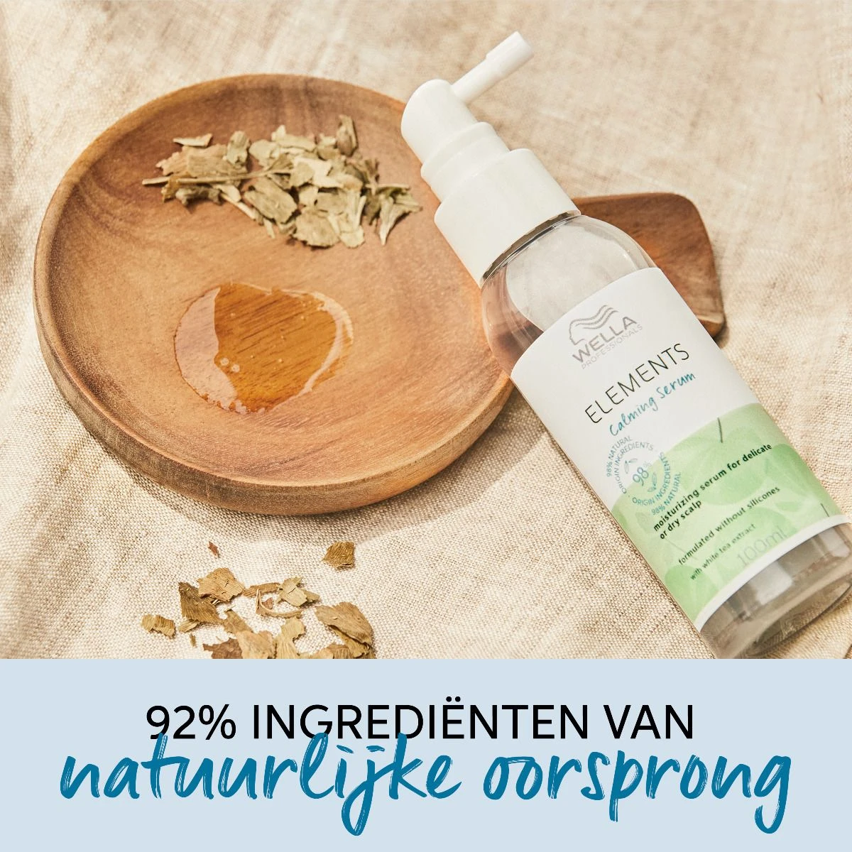 Maak kennis met de groene producten van Wella Elements. De Wella Elements Calming Serum is 100% vegan en vrij van siliconen. Het haarserum bevat voor 98% ingrediënten van natuurlijke oorsprong, waaronder plantaardige glycerine, witte thee-extract en provitamine B5. Daarnaast zit het Calming serum in een 100% gerecyclede plastic fles en een 100% gerecyclede, FSC gecertificeerd kartonnen doosje.